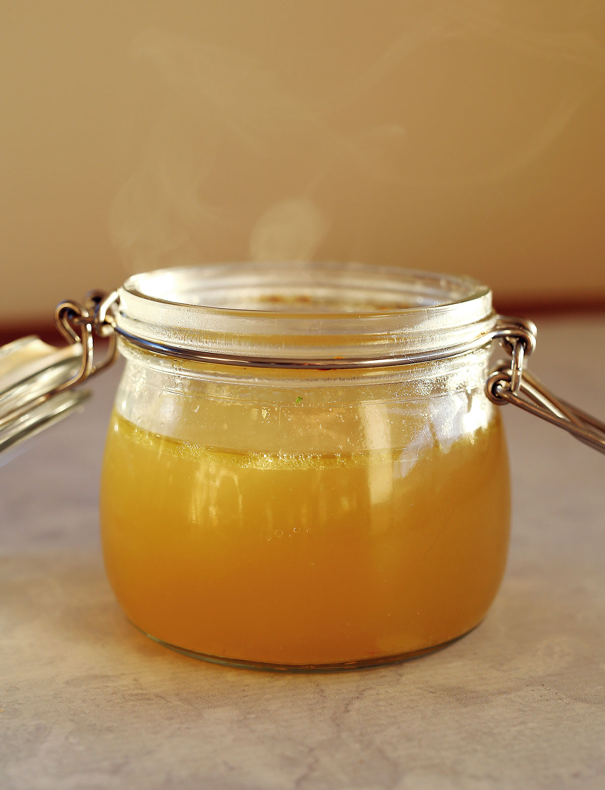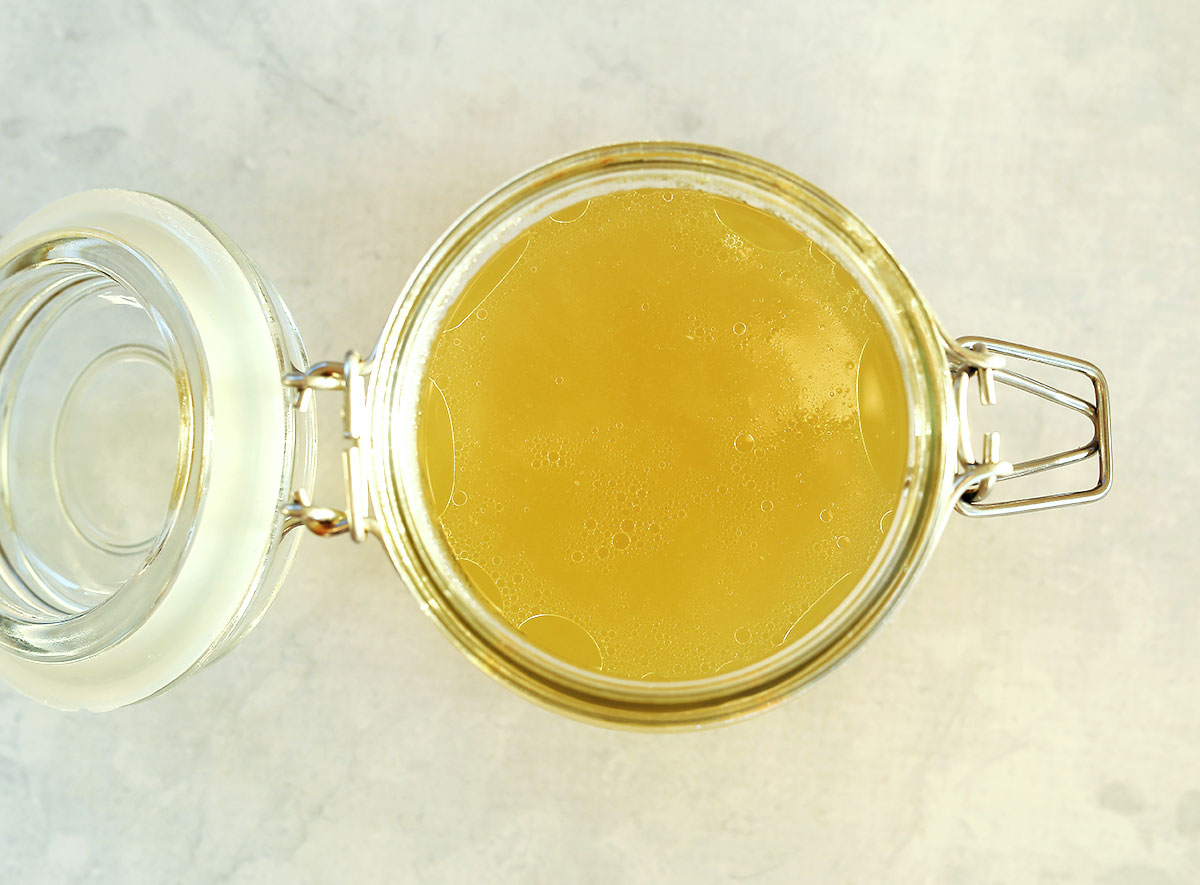 The recipe I have included is for a basic chicken bone broth, you could cook it for twice the time if you want and have the time. Most broth recipes also recommend skimming the surface as you cook, but I have found it actually isn’t needed. Once completely cooled in the fridge, a layer of fat will form on the surface, you can remove this when ready to use, otherwise it helps preserve the stock.