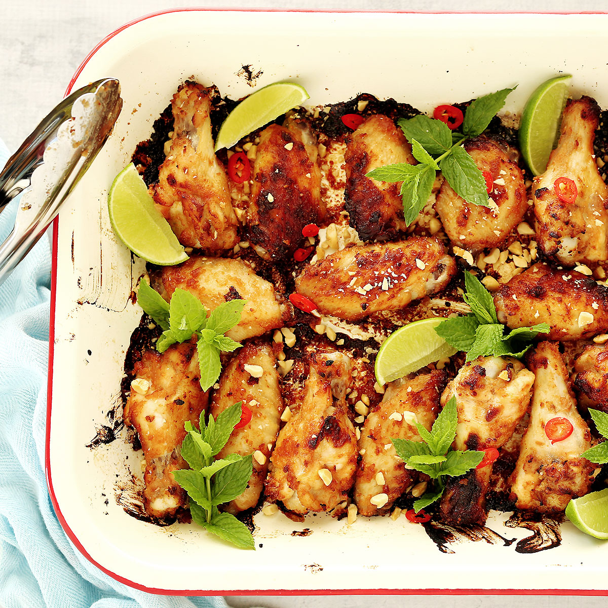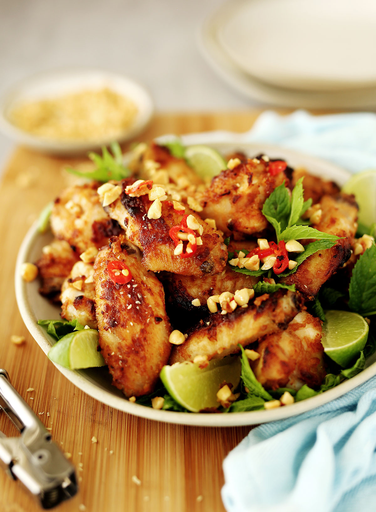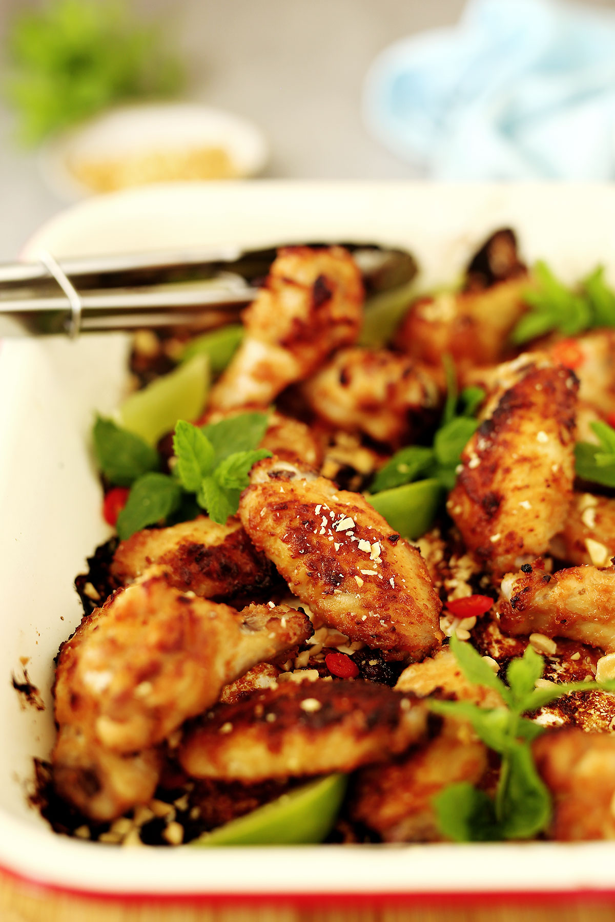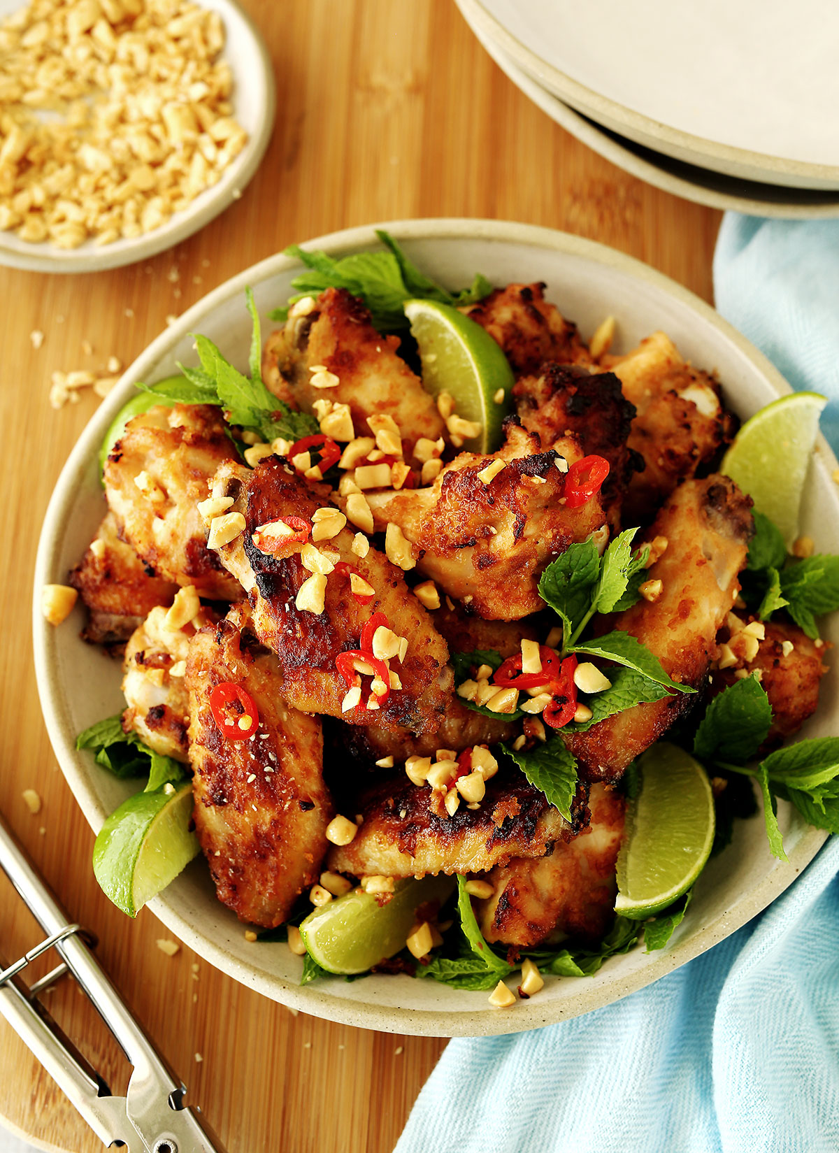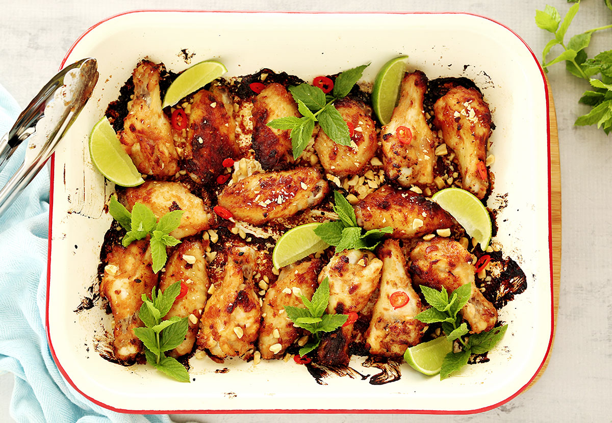 Once all wings are cooked, serve sprinkled with chilli, crushed peanuts and fresh mint.