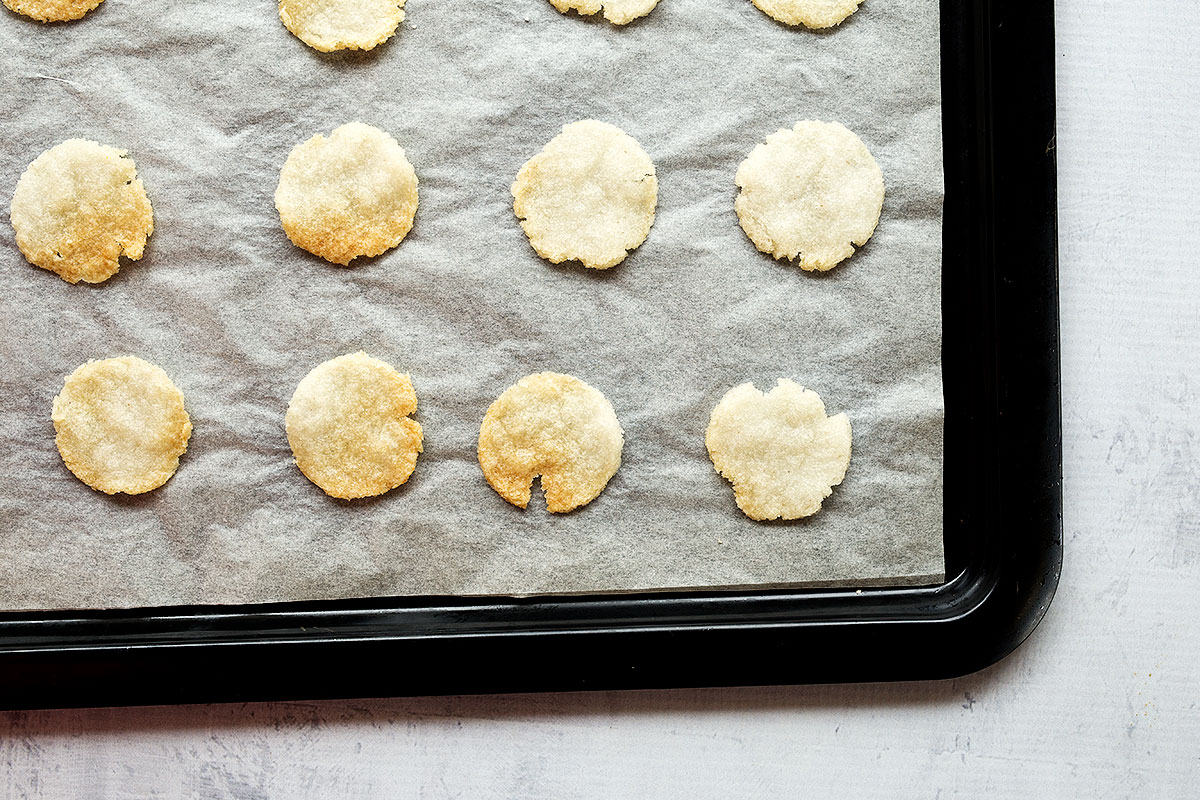 Scoop out 1/2 tablespoons of mixture, roll into a ball and place on tray. Once all balls are on tray, lay another sheet of baking paper over the top and flatten each ball with your fingers or rolling pin.