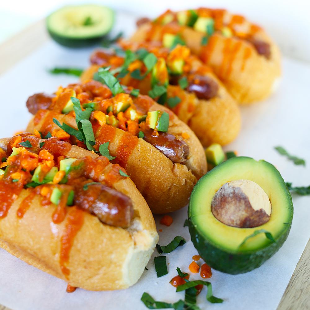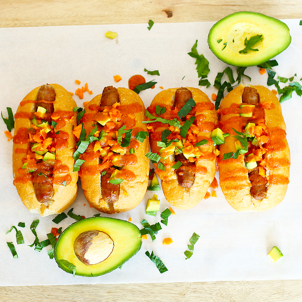 BBQ or pan fry the sausages. Dice the avocado and fill each bun with sausage, avocado, carrot and sauce!