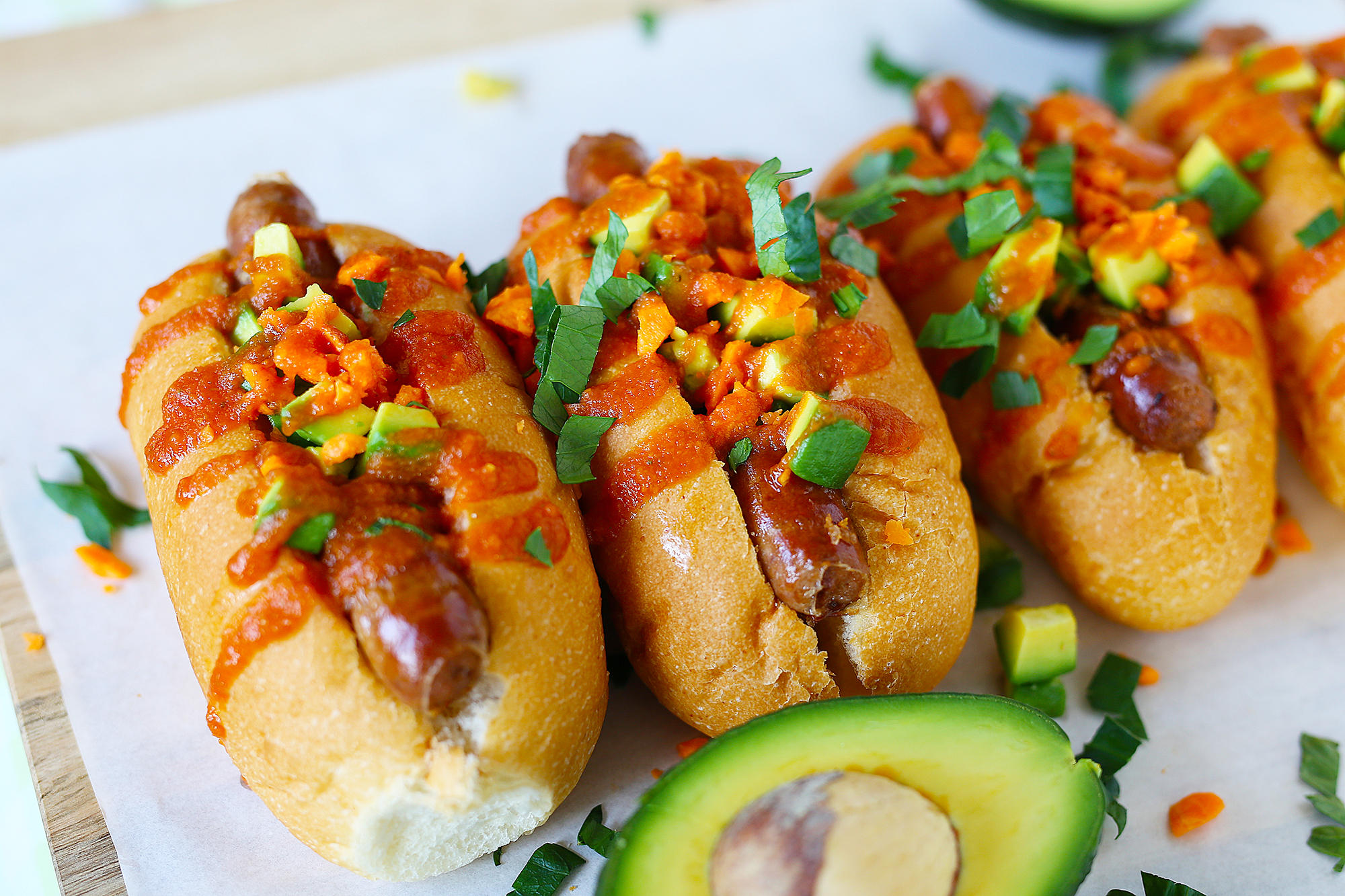 Turn your humble hotdog into a substantial dinner for your family with veggie loaded home made tomato sauce, avocado and pickled carrot!