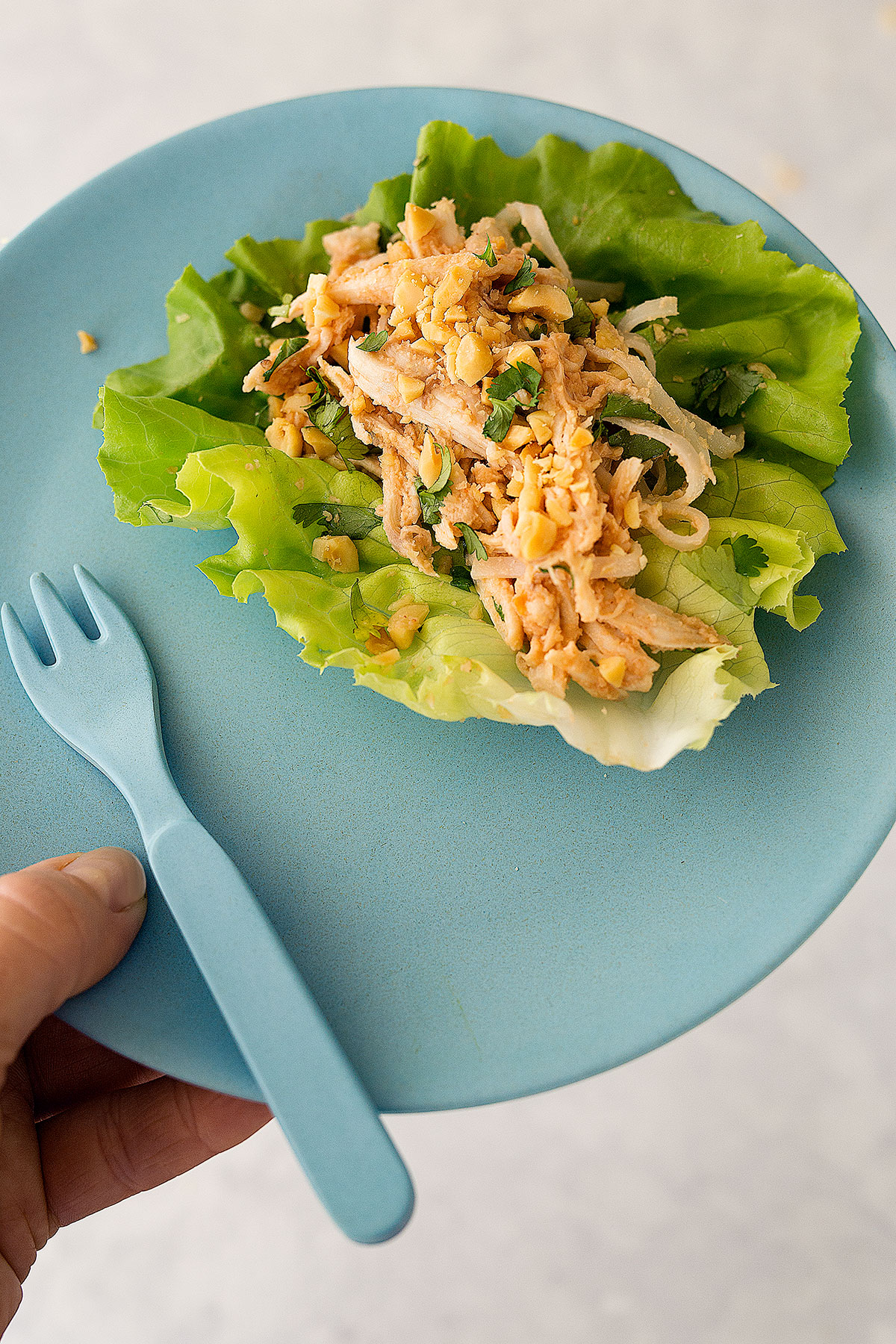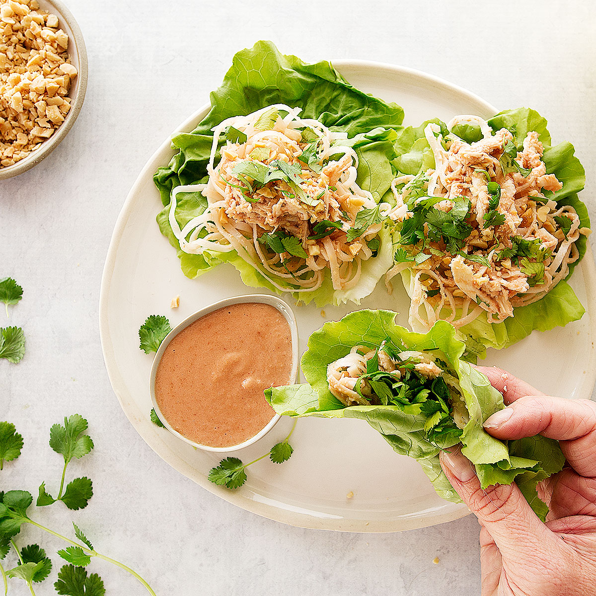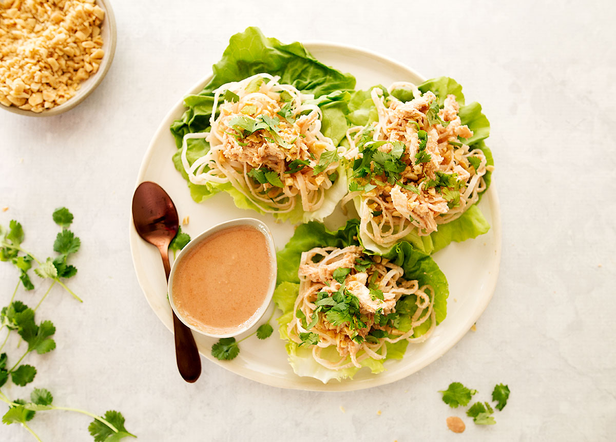 Assemble each lettuce wrap with a large lettuce leaf, noodles, chicken, spoonful of sauce and garnish with crushed peanuts and roughly chopped coriander.