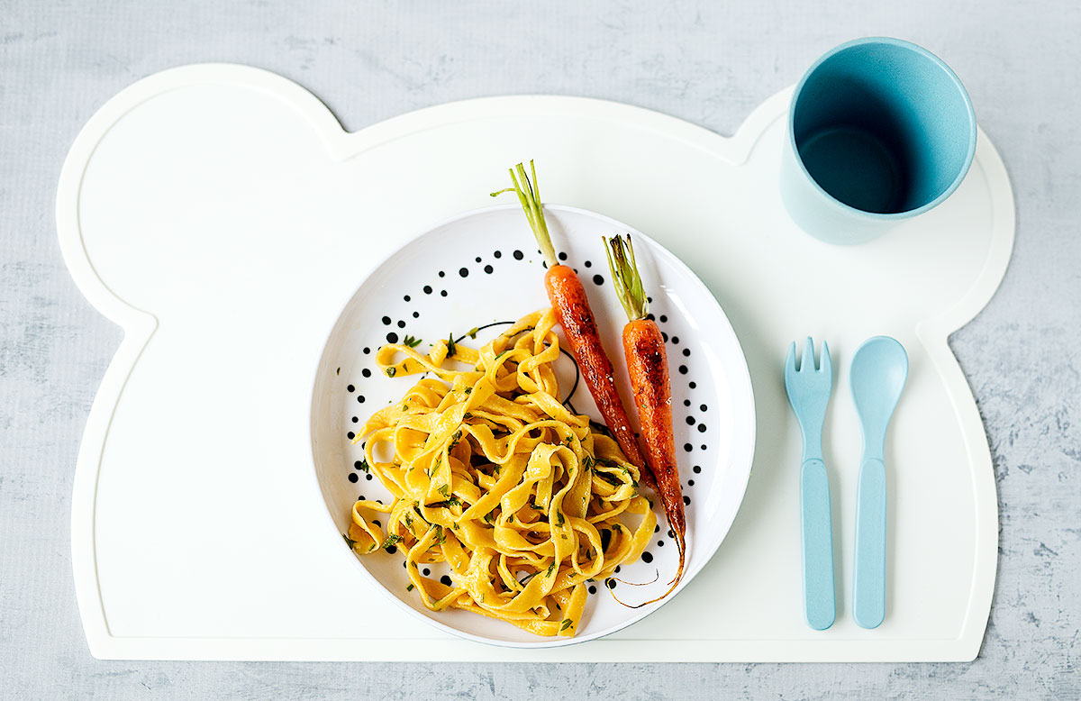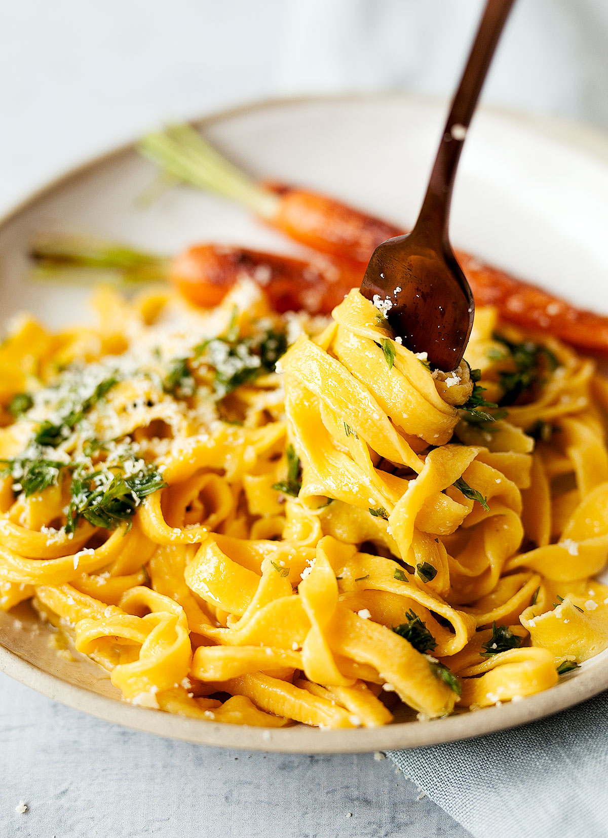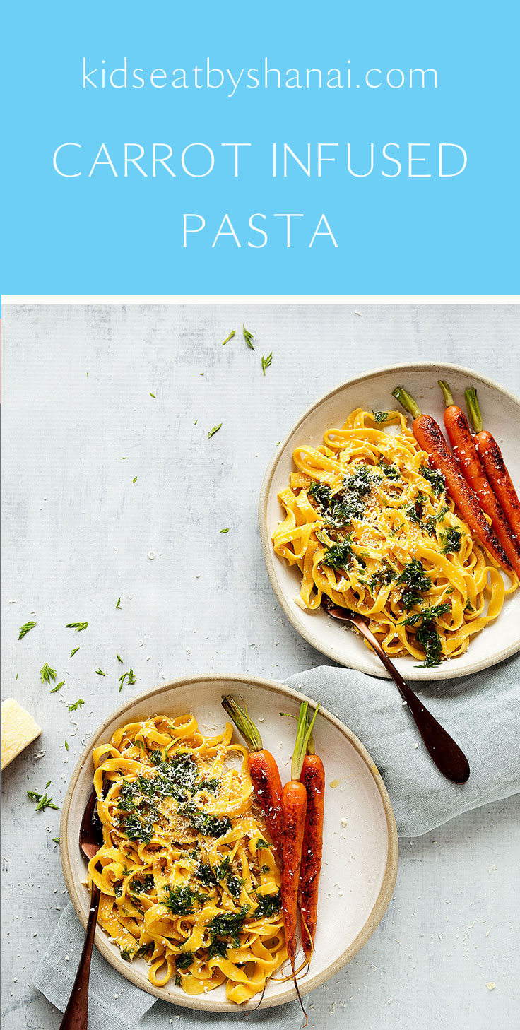 This pasta was so much fun to make with the kids. It’s basically your normal pasta dough with added carrot juice, turning it into a bright orange. Well not as bright as I was hoping, but brighter than a packet of pasta from the store. My kids love rolling out the dough and I am developing an ability to ignore the crazy flour mess until its time to clean up and when I say mess I mean that flour gets everywhere!