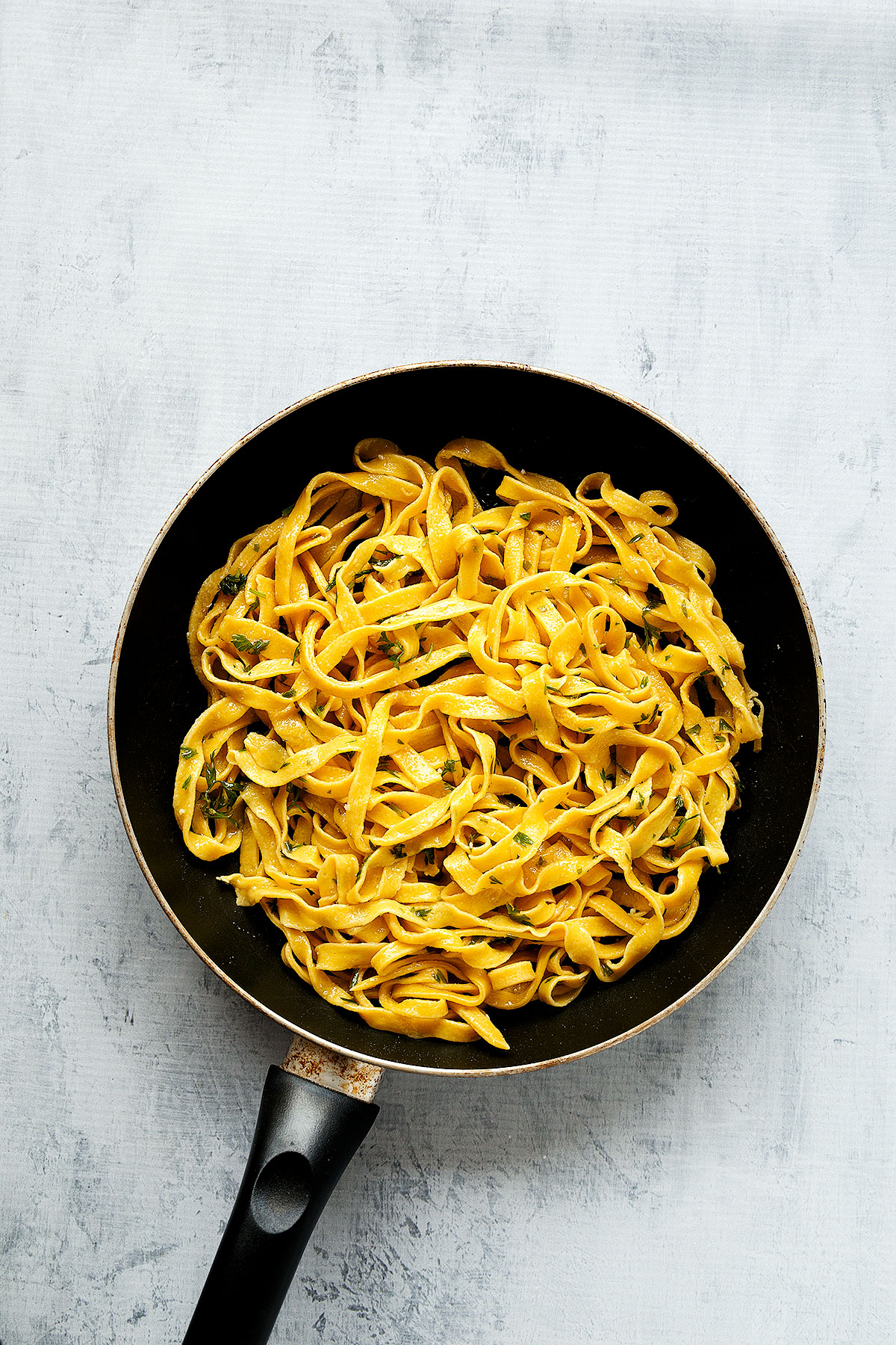 Homemade Carrot Infused Pasta with Carrot Top Salsa Verde