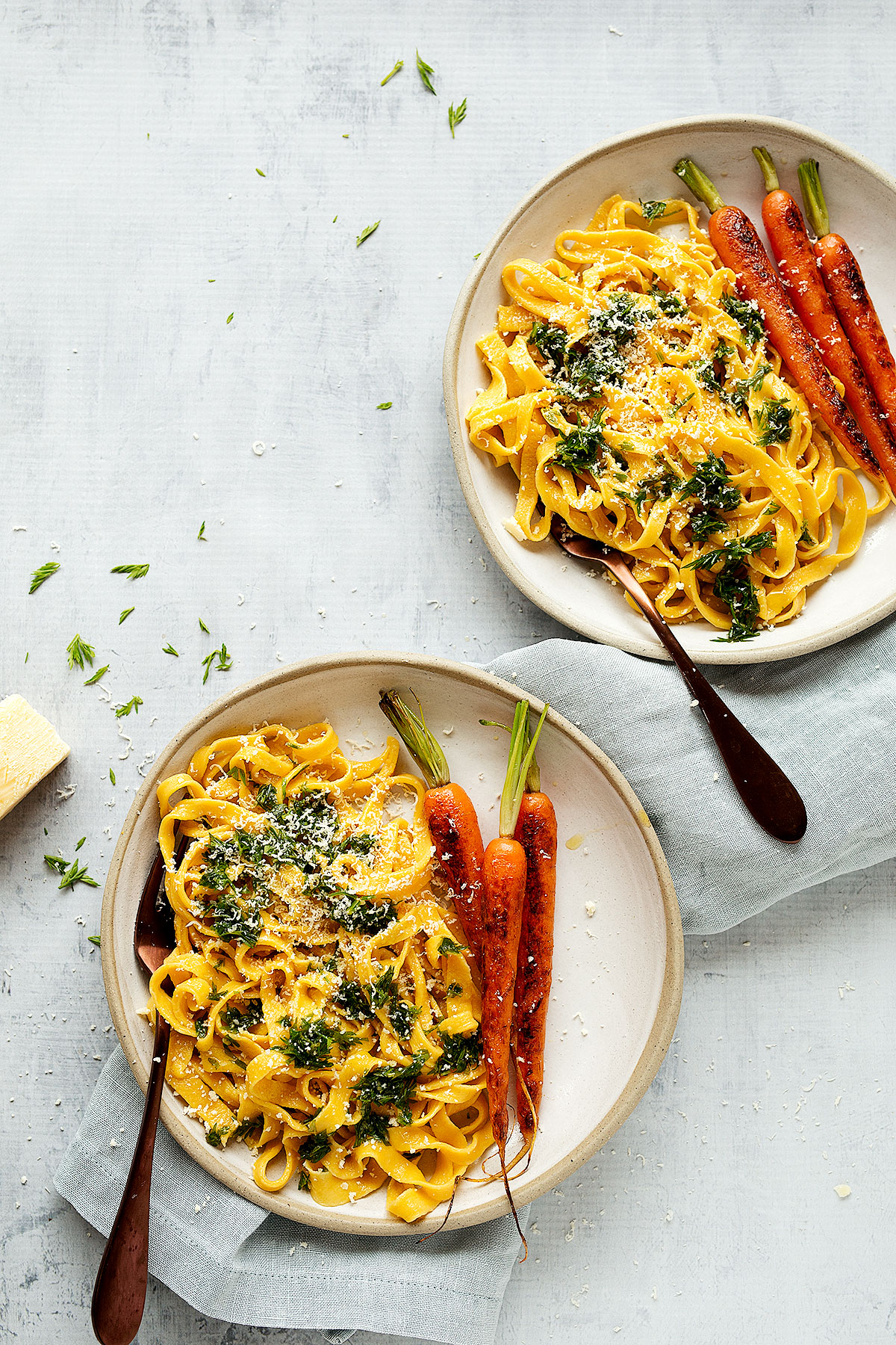 After being inspired from my newest cookbook On Vegetables by Jeremy Fox, I have based this whole meal around a bunch of carrots even using his recipe for carrot top salsa as the pasta sauce. There is a link at the end of this post to get his book. It’s so my favourite at the moment!