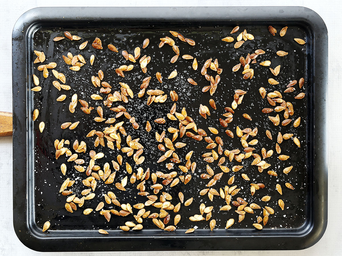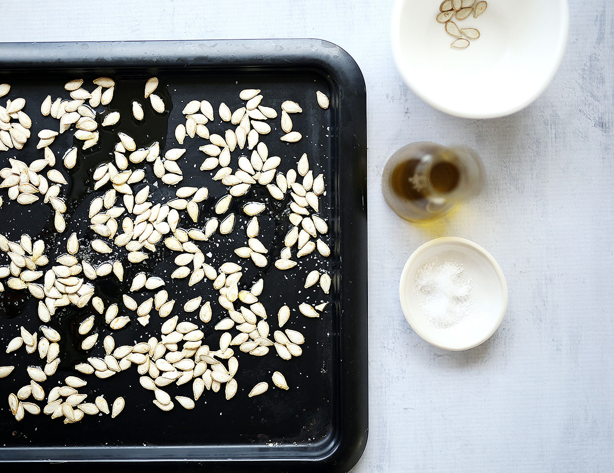 Scrape off any bits of pumpkin flesh then give the seeds a really good wash in a bowl of water, then rinse them under water in a colander. Dry them off with a tea towel.