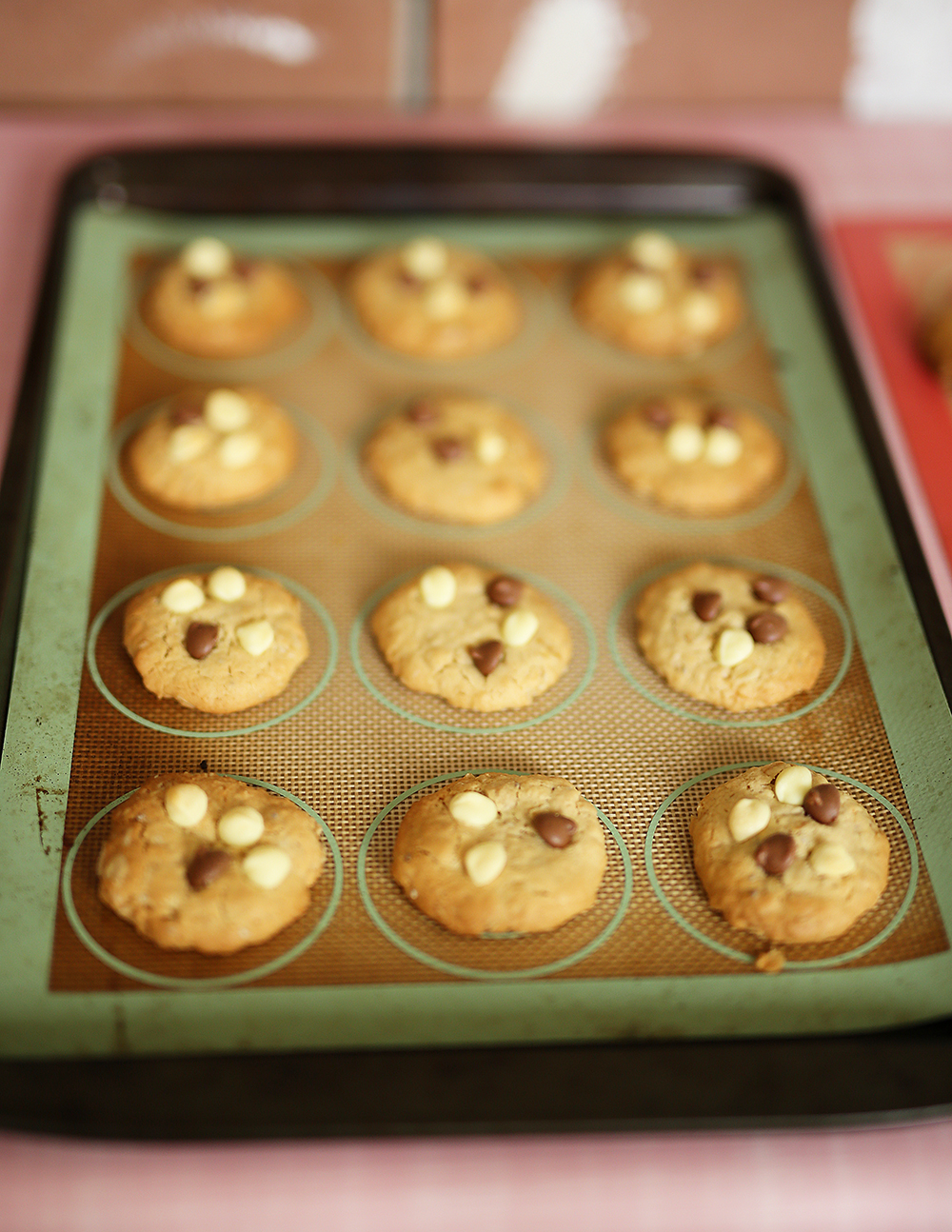 Spoon teaspoon sized balls of dough onto a lined baking tray, about 5cm apart, flatten slightly and top with remaining choc chips.