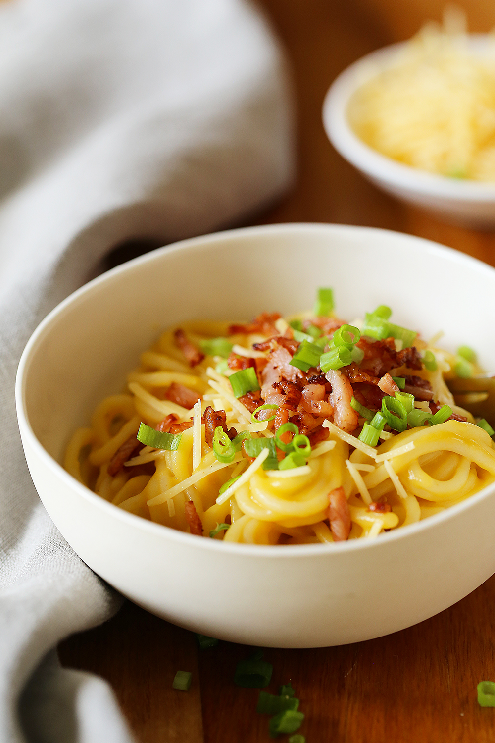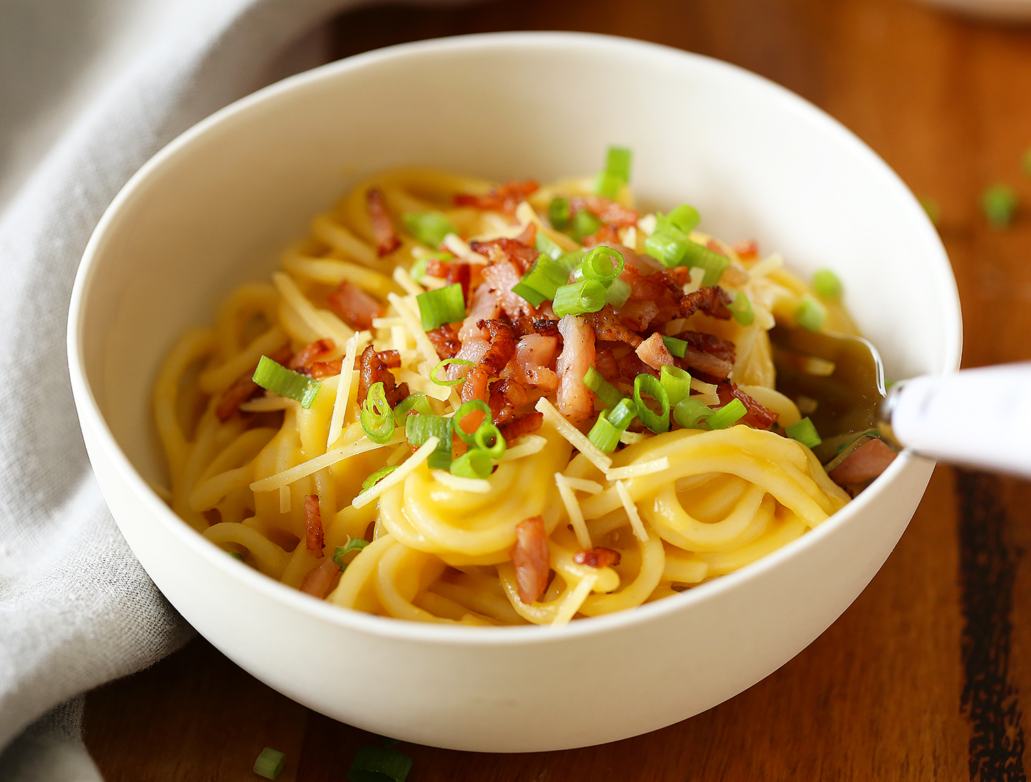 I eat a lot of pumpkin soup, but my kids don’t. They eat a lot of spaghetti. This was the perfect pairing…. just add crispy bacon, cheese and chives and dinner is done! I have a really tasty pumpkin soup recipe here, however, in this case I added a clove of garlic and a parsnip. You could easily sneak in a few extra veggies if you wanted to. The great thing with soup as a pasta sauce is that it’s quite thick and sticks well to the pasta. This recipe throws open a heap of new pasta possibilities with a variety of soups; pea and ham, French onion, creamy chicken, mushroom, cauliflower or sweet potato soup.