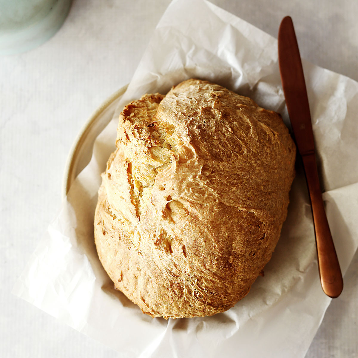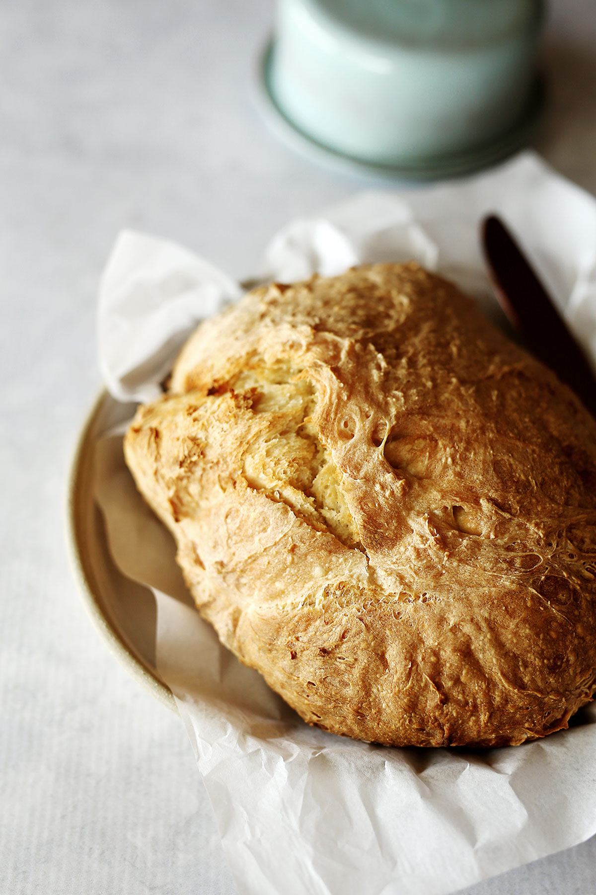 Line a tray with baking paper and dust with flour, place half the dough on top and bake for 45 minutes – 1 hour. Once it is golden and the inside sounds hollow when knocked on the base, it is ready.