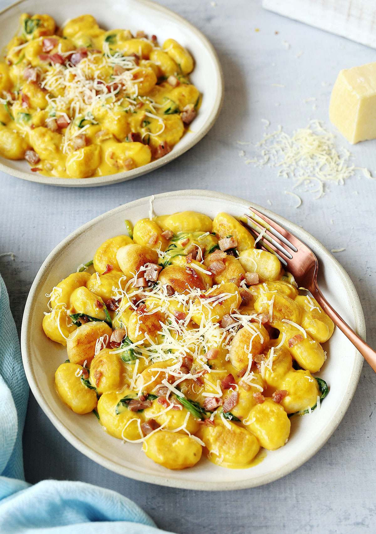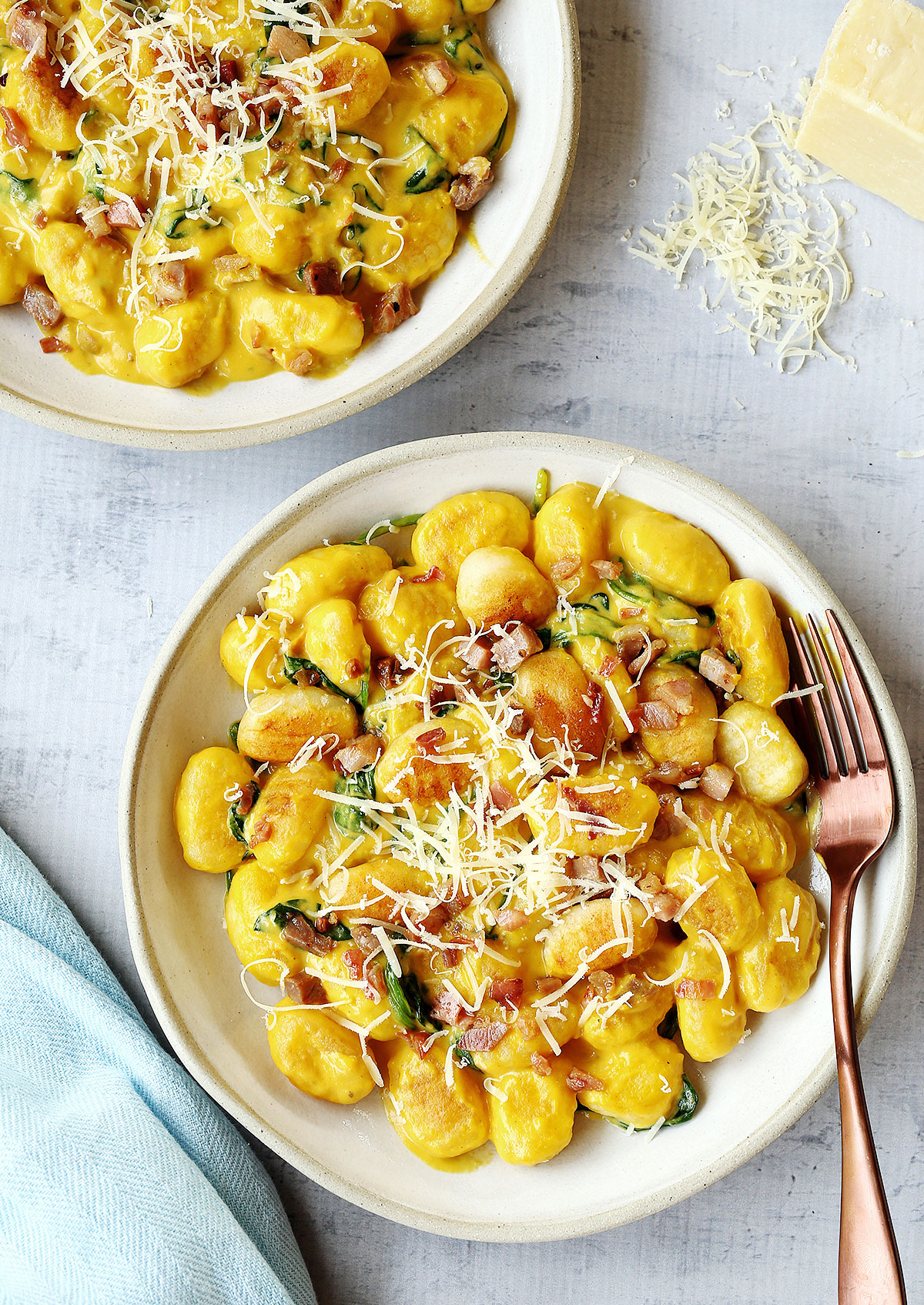 Add the warm pumpkin soup and cream and remove from heat. Stir through spinach and sprinkle with crispy prosciutto and grated parmesan.