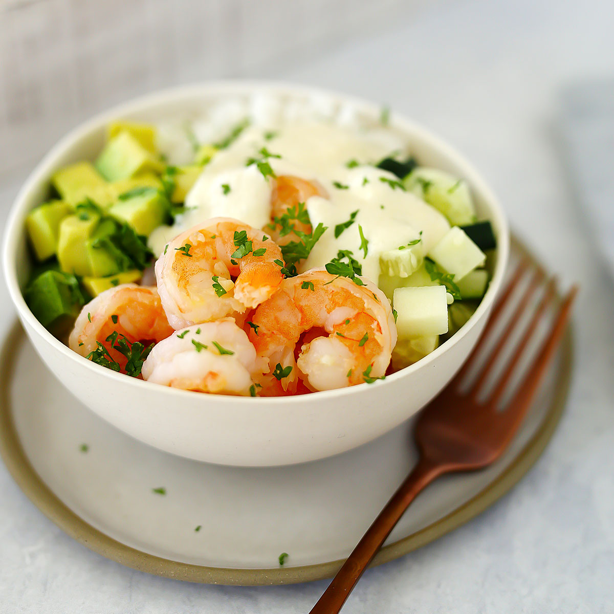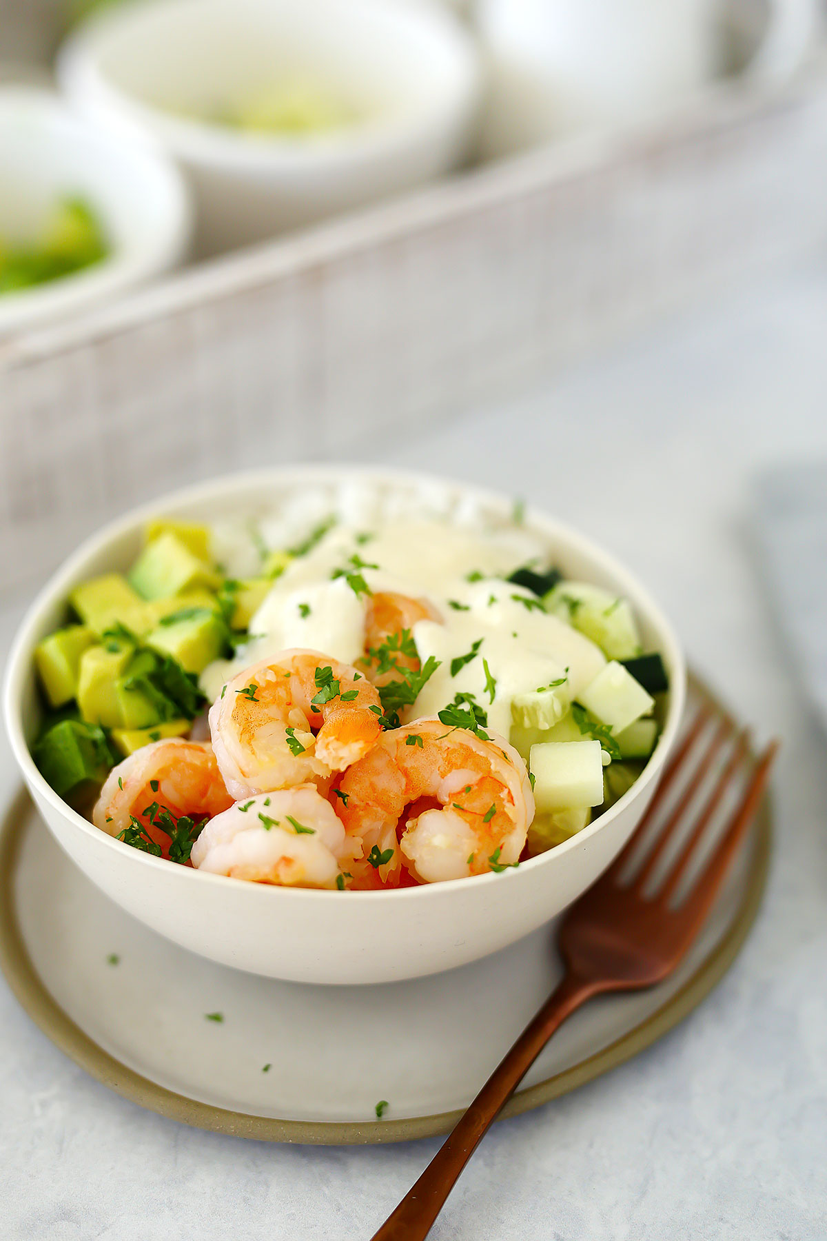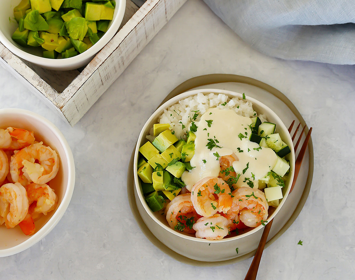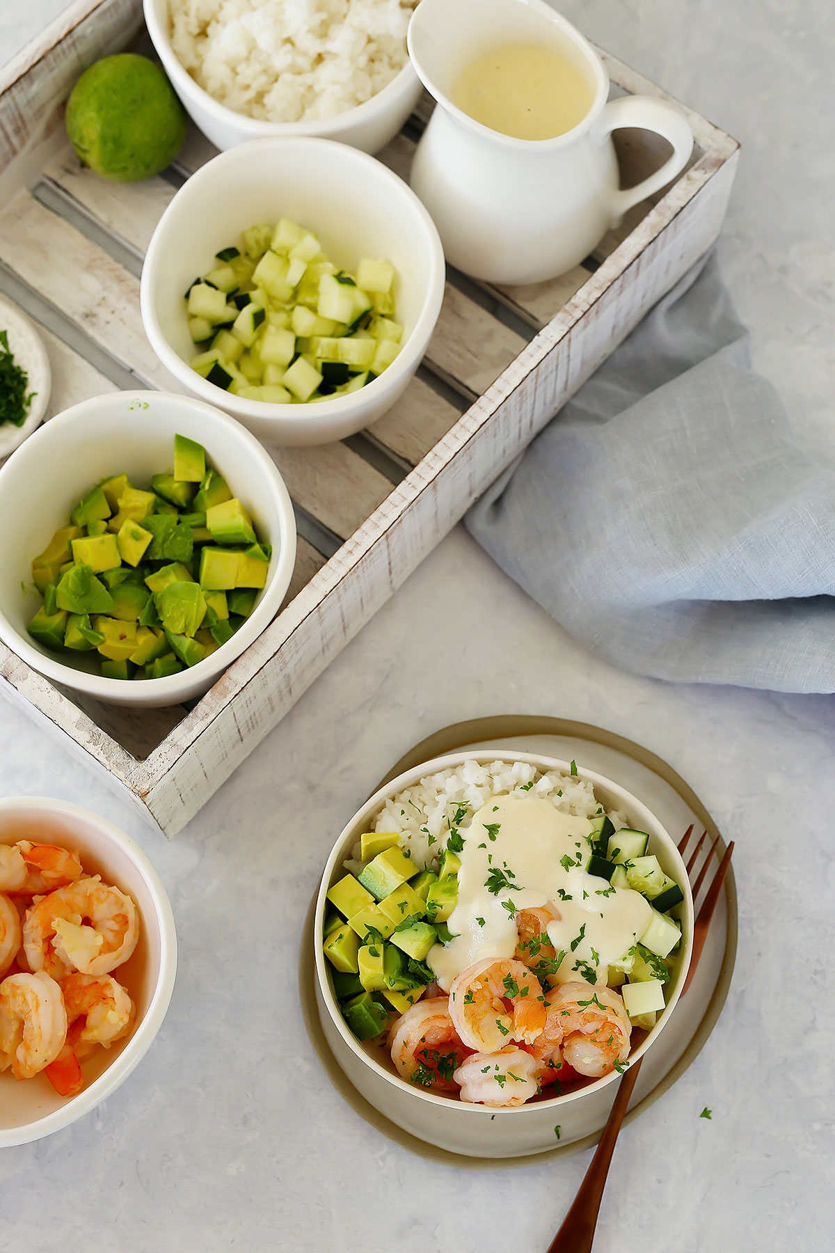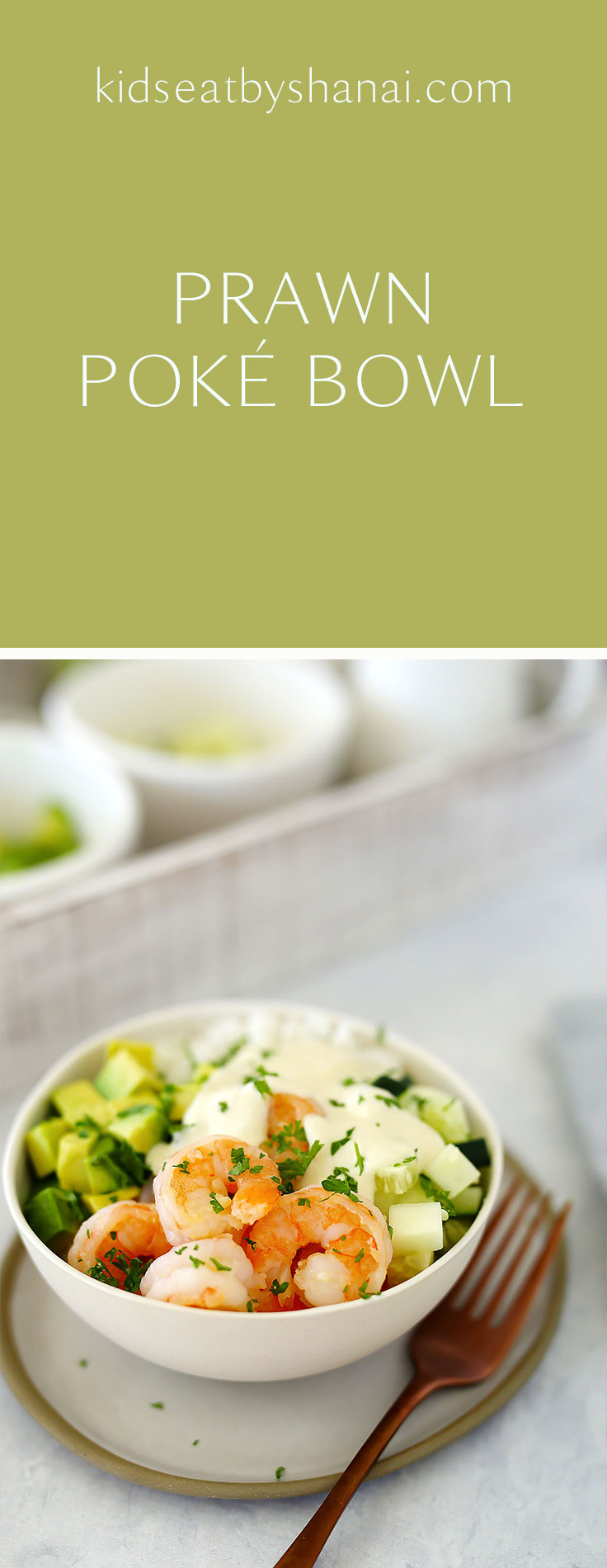 Prawn Poké Bowls made with a healthier version of the classic creamy, garlic prawns. Just place everything in the centre of the table and let everyone build their own!