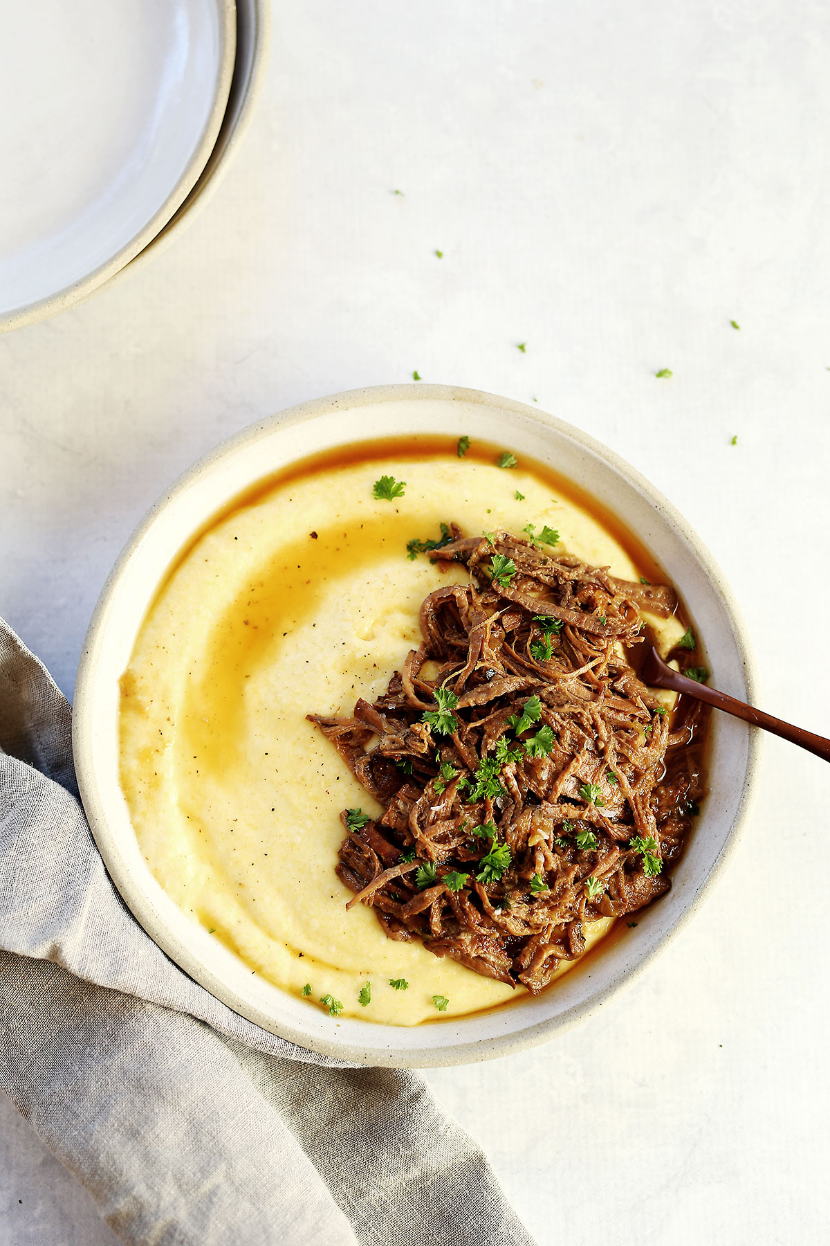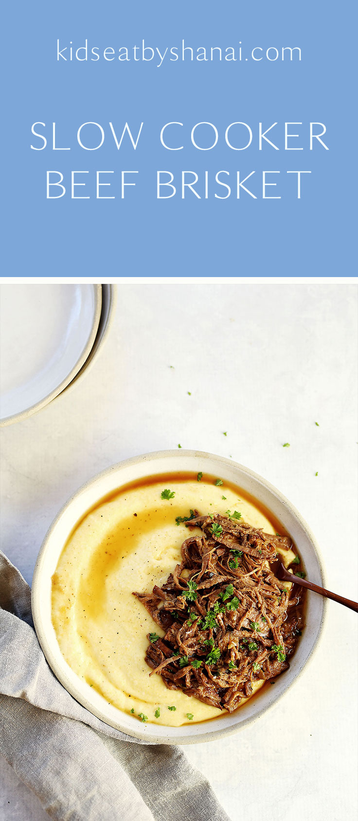 I wanted a dinner that could be made easily in my slow cooker with plenty left over to transform into 2 or 3 more dinners. This is perfect! We had this pulled apart beef brisket with a really creamy polenta (indulgently made with plenty of cream and cheese). Then the following night I turned it into a rich, tomato based ragu with pappardelle. (recipe will be up shortly).